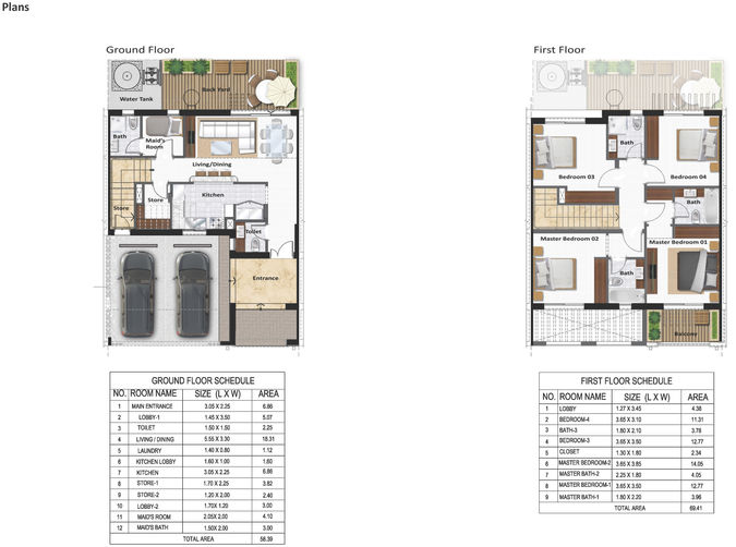 The townhouses are composed of 3 and 4 Bedrooms that are strategically distributed on site. Each town-house is composed of ground and first floor. The ground floor contains a spacious living/dining area, a maid’s room, laundry/store room and a spacious backyard, whereas the upper floor includes 3/4 bedrooms. More-over, each unit will have allowable space for 2 parking lots. These units are distributed over three separate plots with parks, mosques, schools and amenities located at a close proximity.